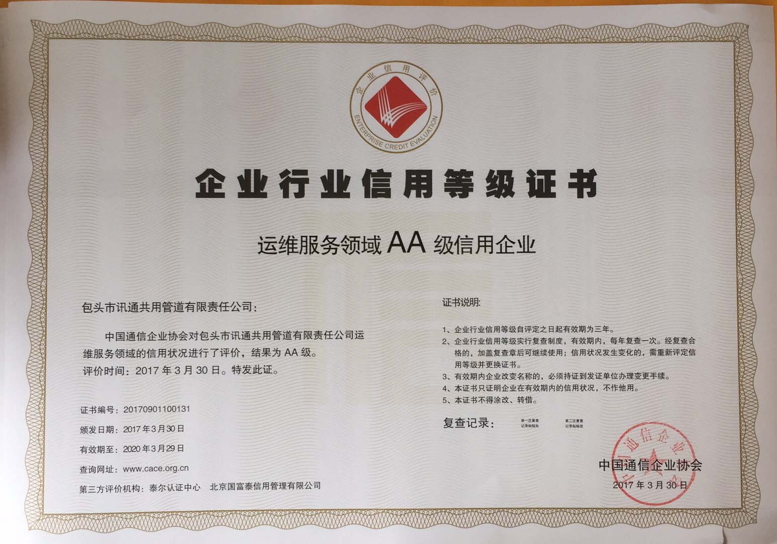 運(yùn)維服務(wù)領(lǐng)域AA級信用企業(yè)證書
