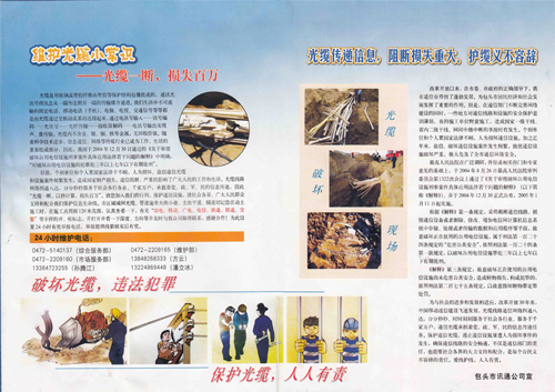 進入春季后是市政各項施工改造的高發(fā)期,為了保證光纜管道線路不受突發(fā)性施工的損壞、提高市民對光纜線路保護的意識,我公司多次開展深入社區(qū)進行護線宣傳活動?,F場發(fā)放宣傳材料、講解保護光纜線路的重要性、釘掛護線安全標志牌,動員市民自覺加入光纜保護的行列。